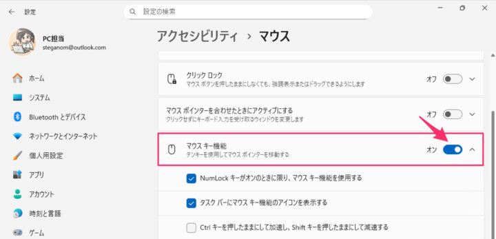 これでテンキーでマウスカーソルを操作することができます。