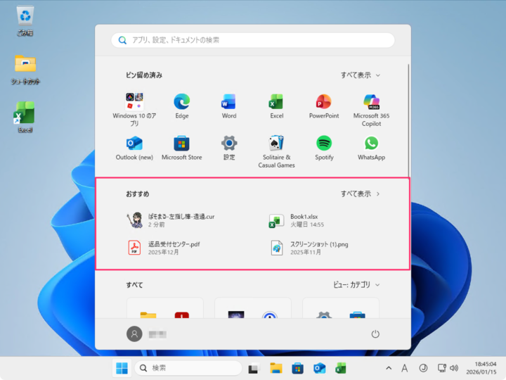 非表示にしたスタートメニューのおすすめを再度表示する方法です。