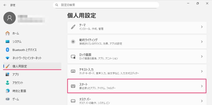 設定が開いたら、左メニューの「個人用設定」をクリックします。