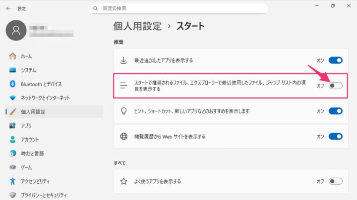 「スタートで推奨されるファイル・・・」をオフにしましょう。