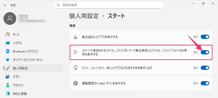 「スタートで推奨されるファイル・・・」をオンにしましょう。
