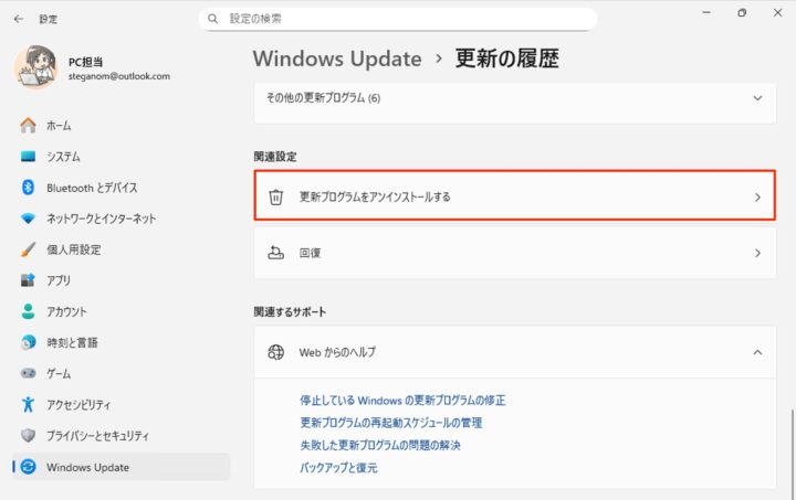 画面を下へスクロールし、「関連設定」セクションの「更新プログラムのアンインストール」をクリックします。