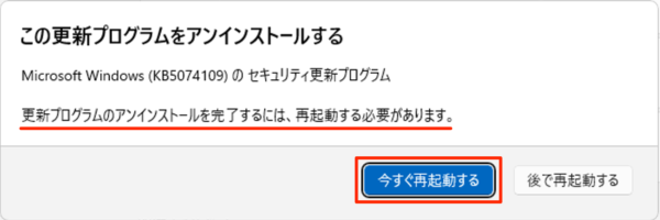 更新プログラムのアンインストールを完了するには、再起動する必要があります。