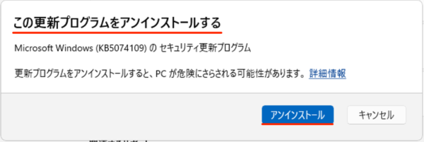 更新プログラムをアンインストールです。「アンインストール」をクリックします。